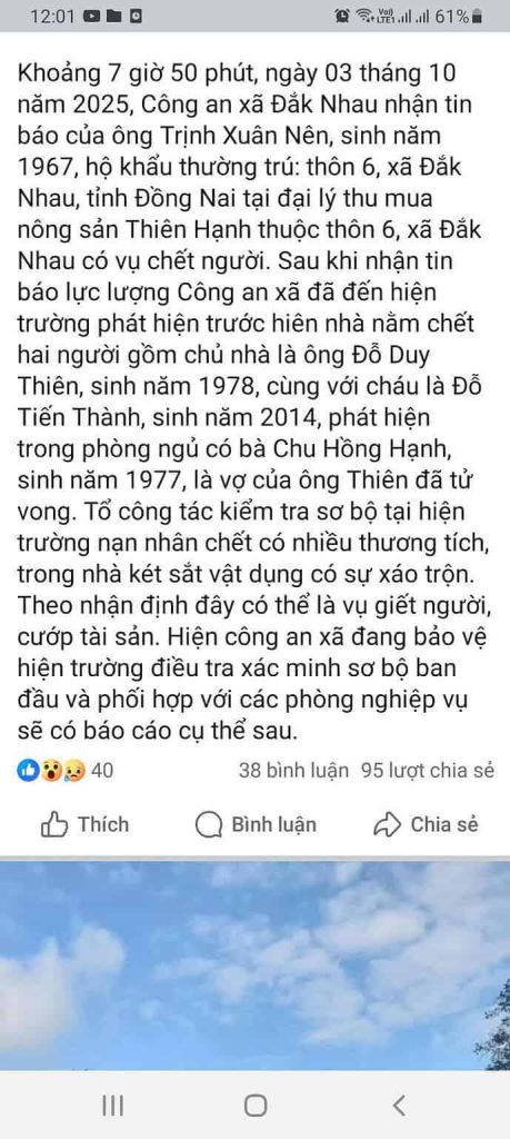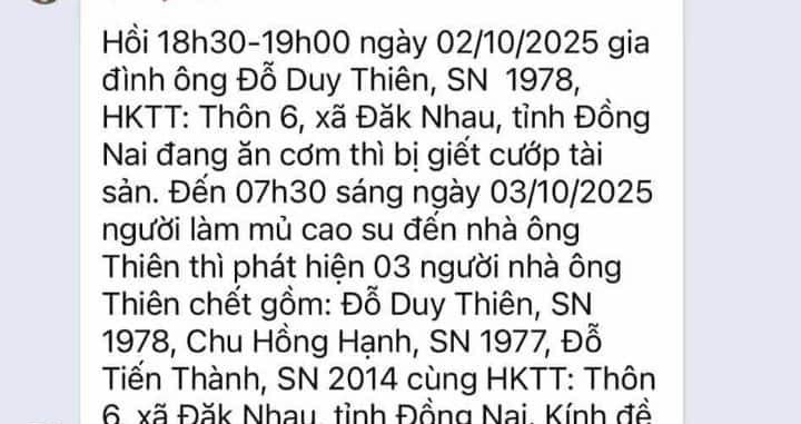 Tối 2/10/2025, tại xã Đắk Nhau, huyện Bù Đăng (tỉnh Bình Phước) đã xảy ra một vụ việc đặc biệt nghiêm trọng khiến 3 người trong cùng một gia đình thiệt mạng.
