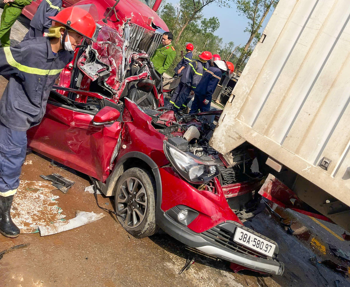 Cú va chạm khiến xe ô tô con BKS 38A – 580.97 bị hư hỏng nặng, phần đầu biến dạng và mắc kẹt dưới gầm xe tải, gây nhiều khó khăn cho công tác cứu hộ. Ba người trên xe con sau đó được lực lượng chức năng và người dân đưa ra ngoài, chuyển đi cấp cứu trong tình trạng bị thương.